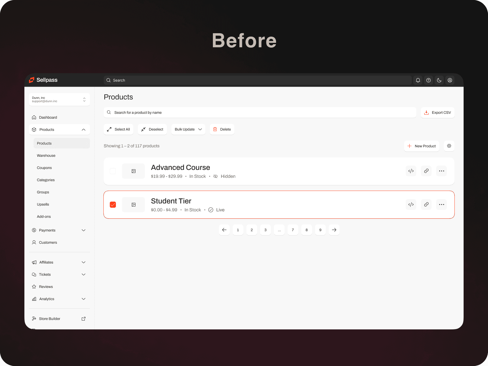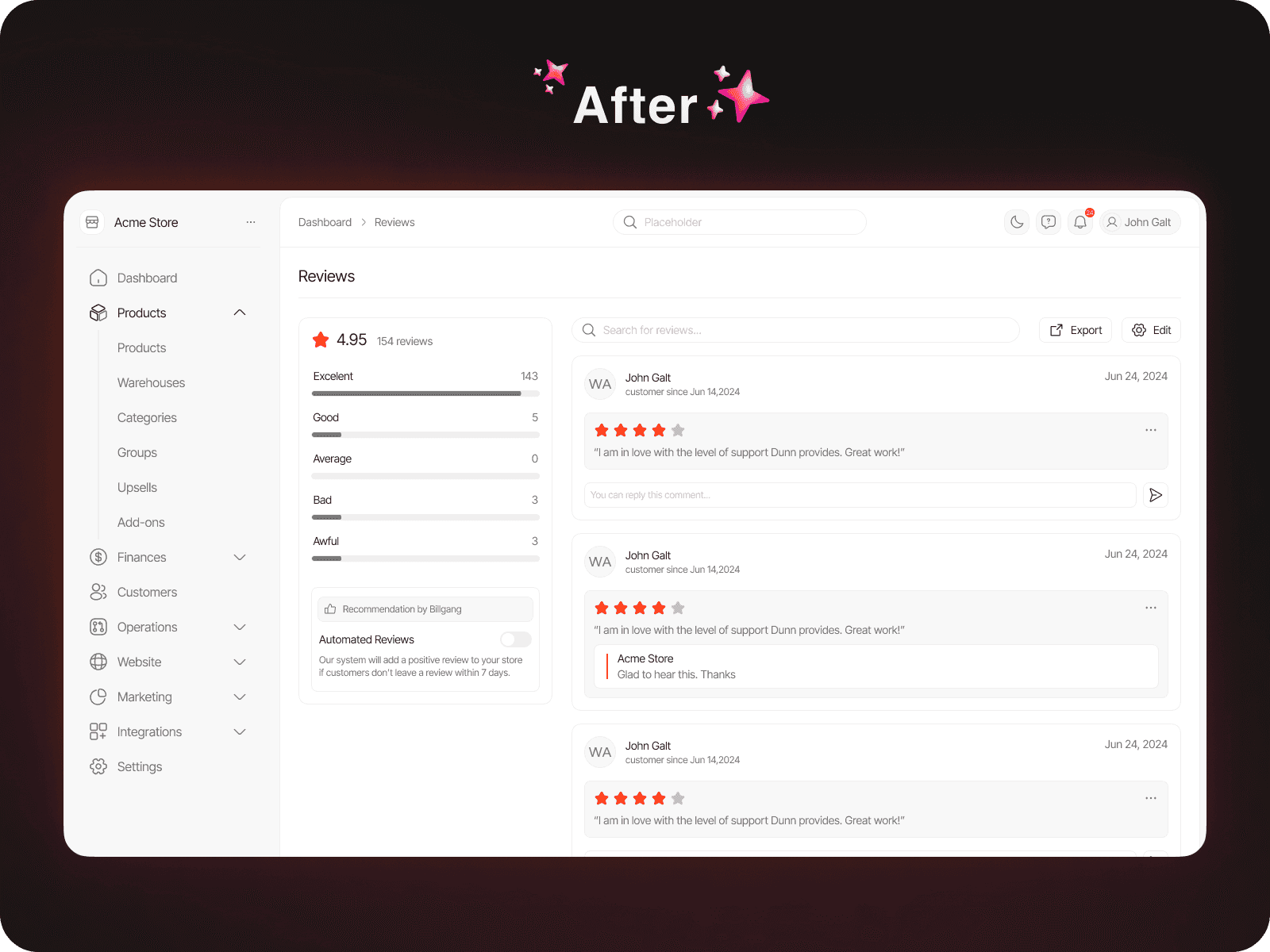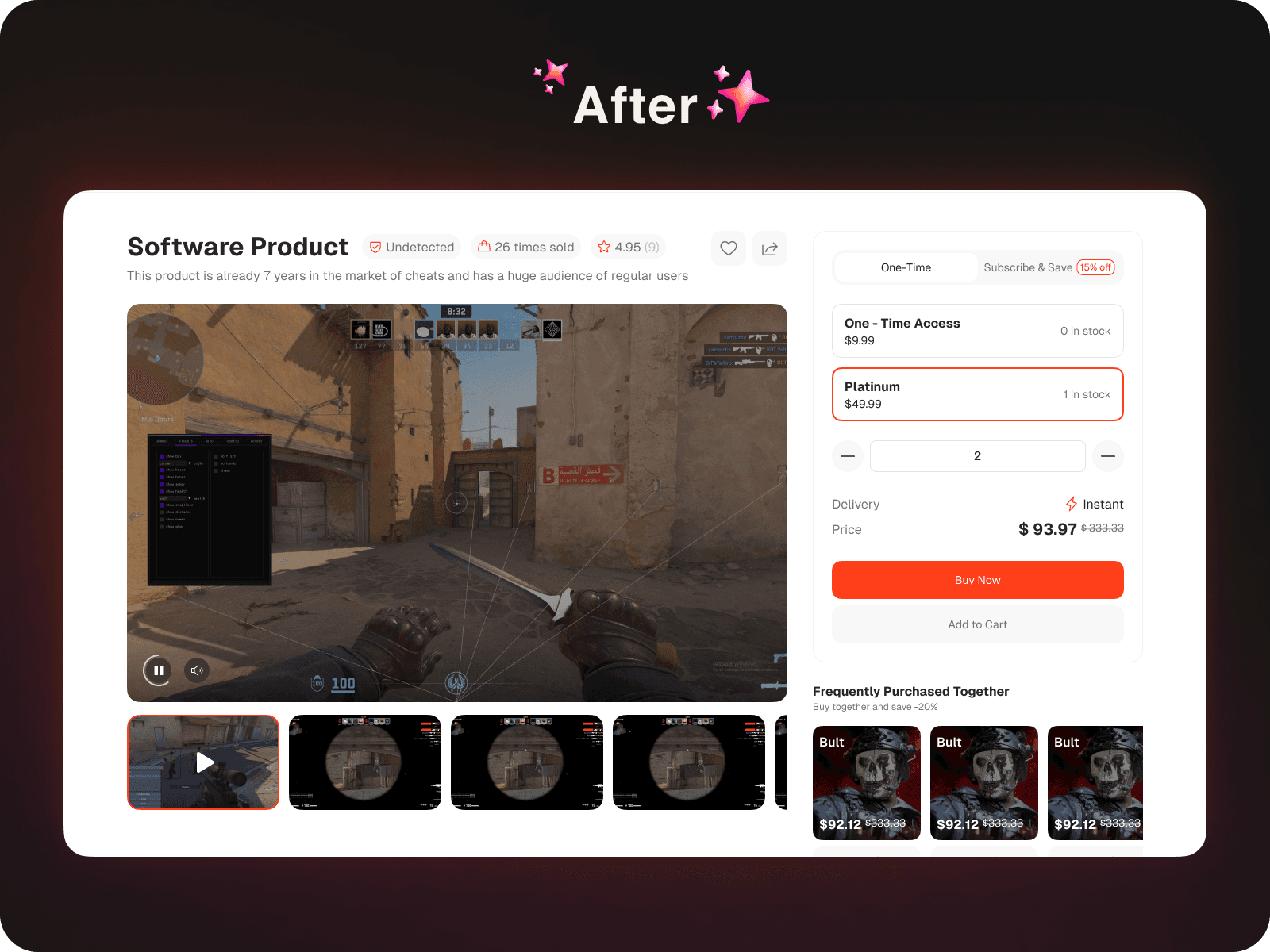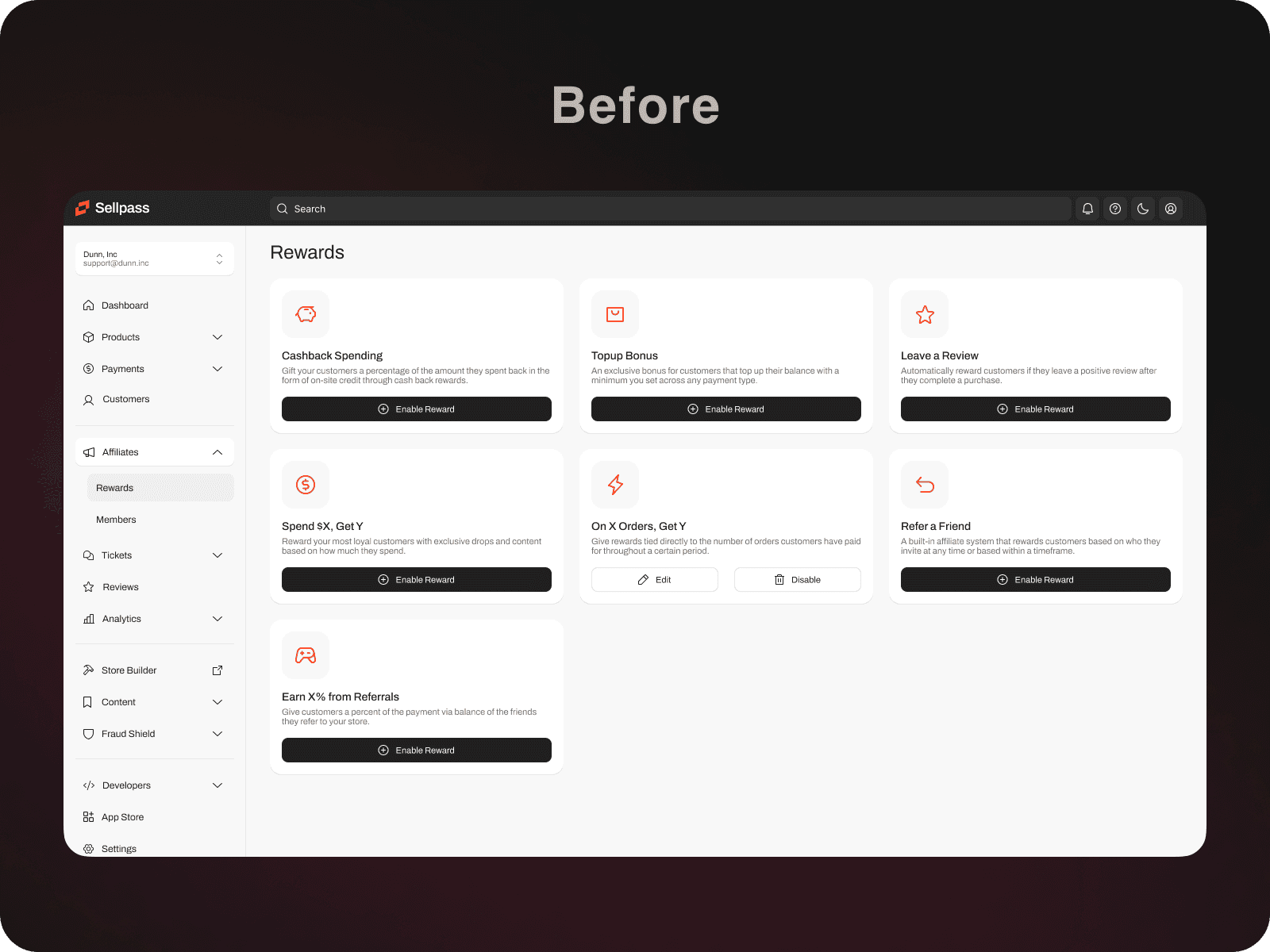 In 2021, the Sellpass product was launched, which allowed small and medium-sized businesses to quickly create online stores for digital goods with 0% commission. In 2023, the management decided to expand the functionality and rebrand: the product became known as Billgang, and a new version with improved features was released in beta in February 2024. My task was to create an updated design system, customize the project and implement improvements to enhance the quality of the product.