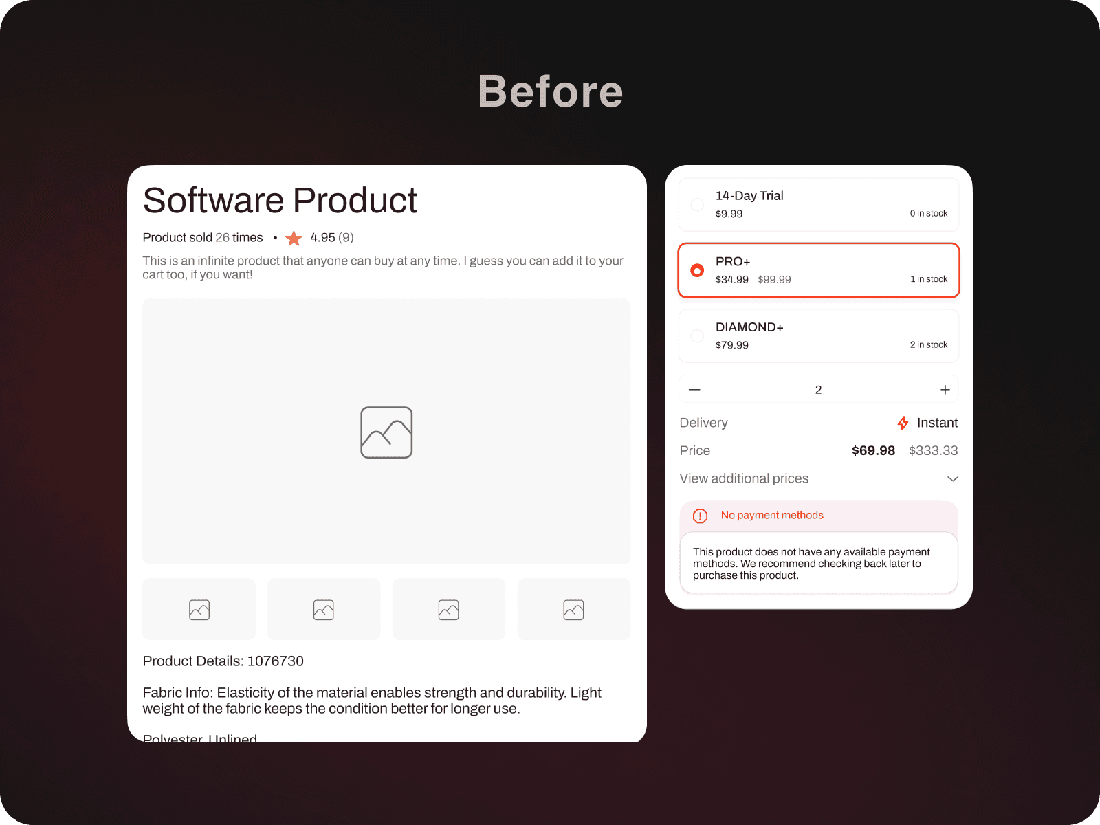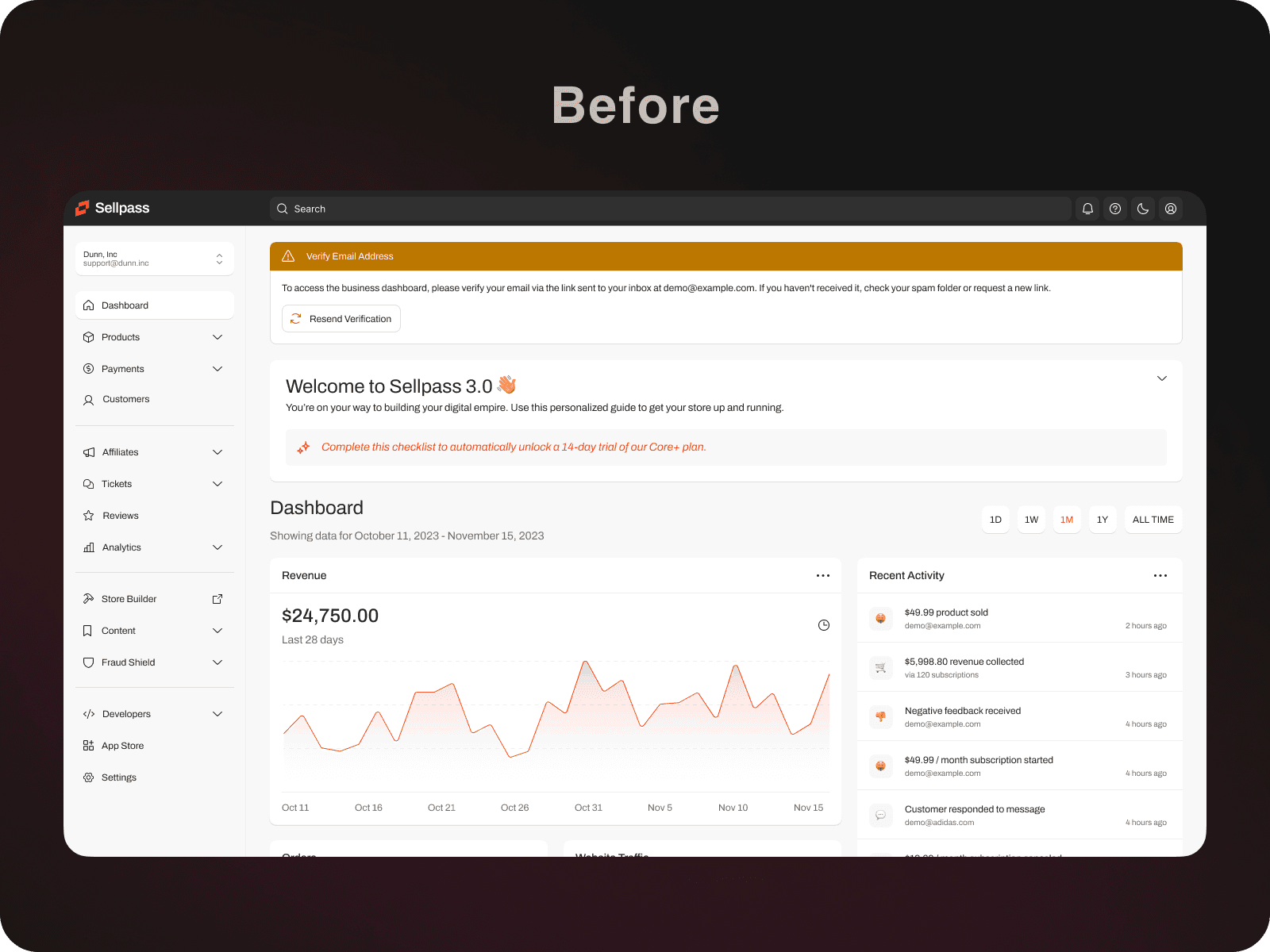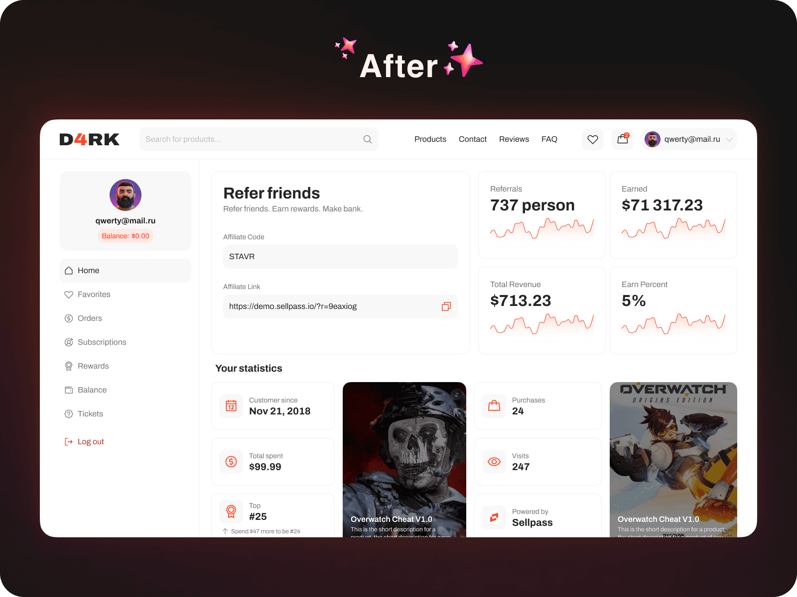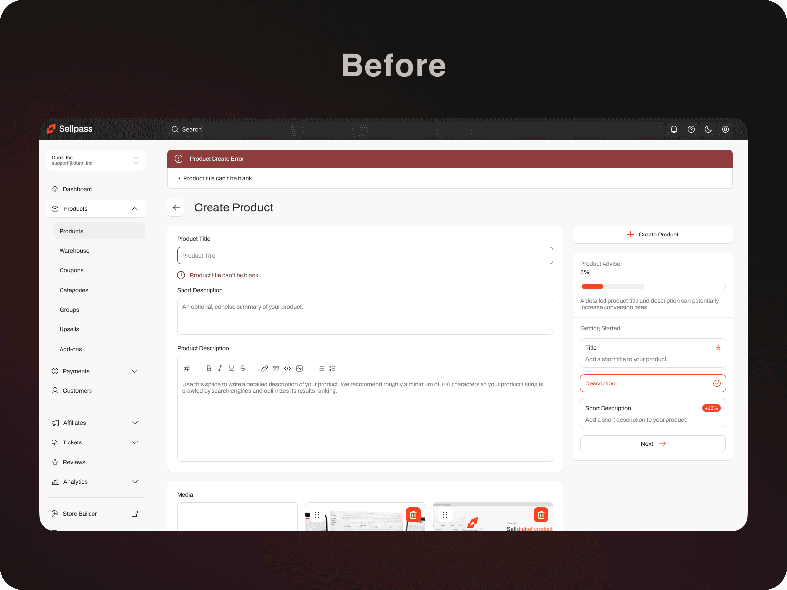 In 2021, the Sellpass product was launched, which allowed small and medium-sized businesses to quickly create online stores for digital goods with 0% commission. In 2023, the management decided to expand the functionality and rebrand: the product became known as Billgang, and a new version with improved features was released in beta in February 2024. My task was to create an updated design system, customize the project and implement improvements to enhance the quality of the product.