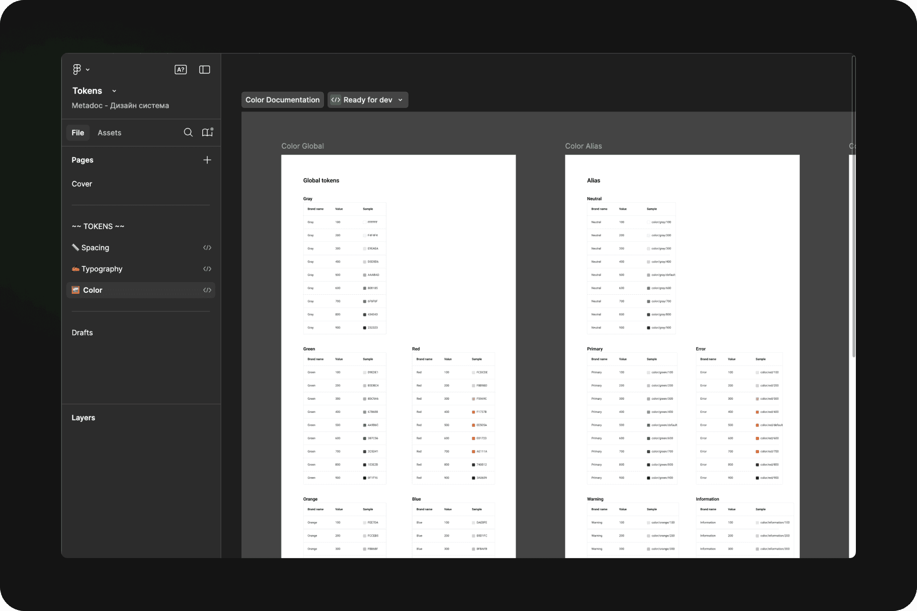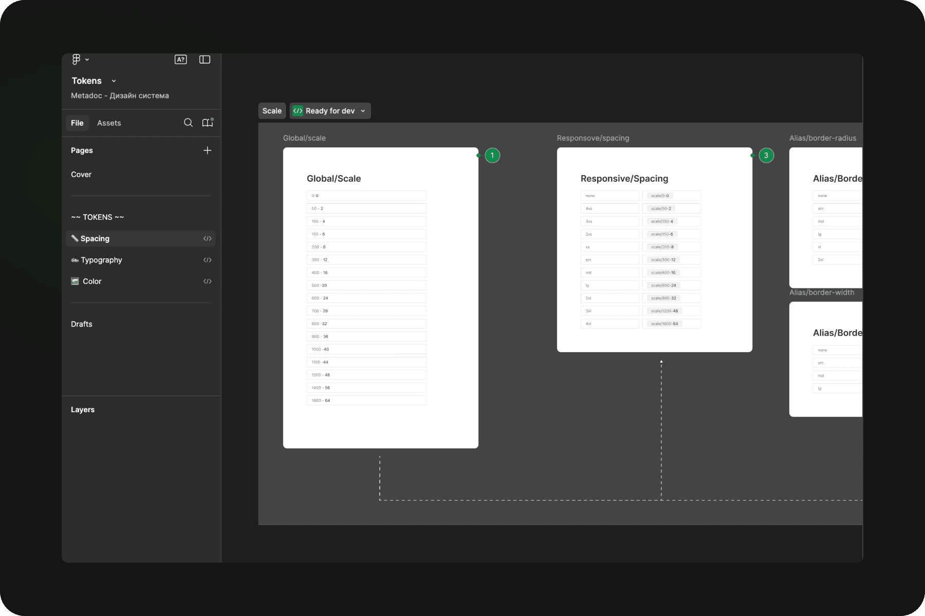 The most difficult part. An audit was done on the system - what tokens there are in general and how we will name them. Then with the front-end team came to the decision of the development scheme (what tokens will consist of): Global →Alias→Mapping . Ran all tokens through this schema (but some were just in the same level of “Responsive”). Documented them and gave them to development.