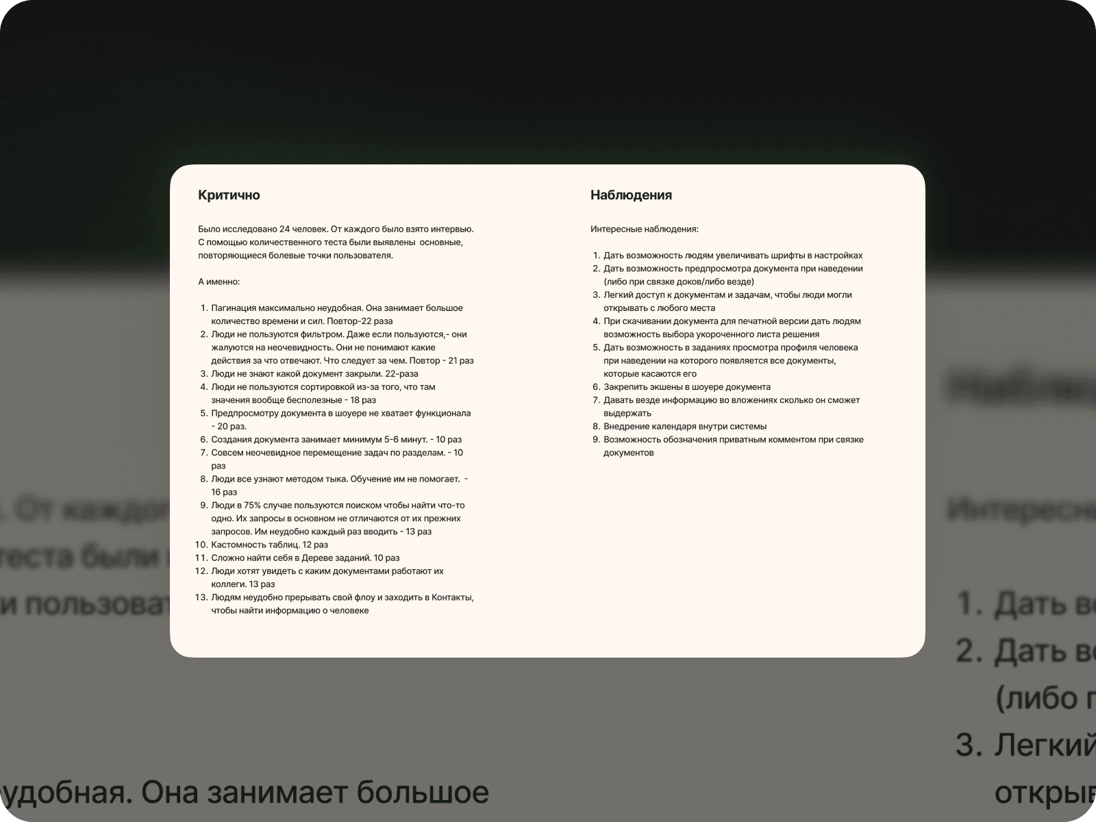 Then I did some qualitative analysis, organized meetings with the main focus groups. I talked to them, gave them tasks and from that I collected pain points and observed how they actually work and recorded everything of course.